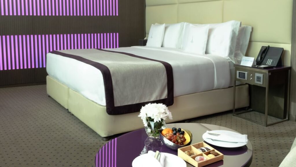 Elegantly contemporary, our Deluxe Rooms at The Torch Doha span 42 square metres and feature a cutting-edge work area equipped with an iPad-based In-Room Solution, an interactive 43-inch LED TV, and in-room Wi-Fi.